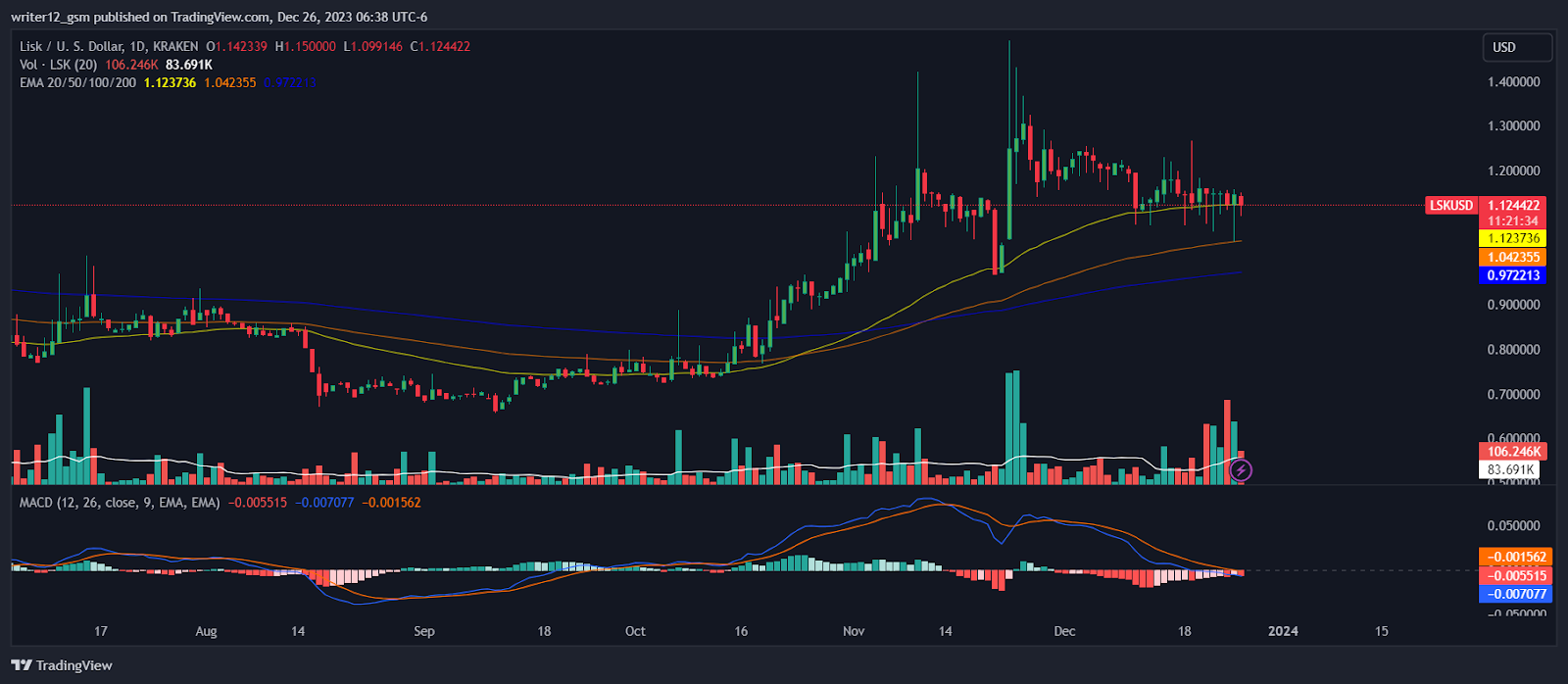 At the time of publishing, Lisk crypto (USD: LSK) is trading above the 50 and 200-day daily moving averages (DMAs), which are supporting the price trend.