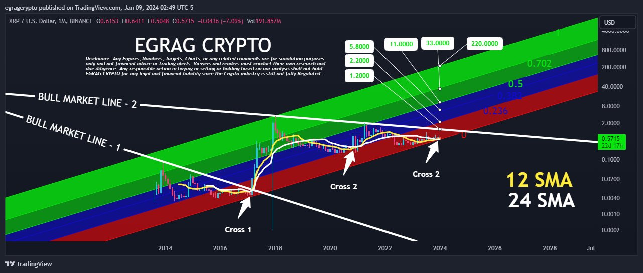 EGRAG, a seasoned market analyst, has set multiple $XRP price targets at $1.2, $2.2, $5.8, $11, $33, and $220, stationed at pivotal Fibonacci levels amid recent bullish SMA cross.