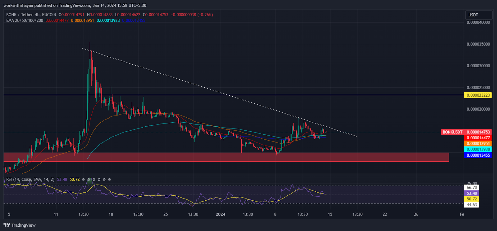 Buyers are defending the Bonk price above moving averages on the 4-hour chart. However, the descending resistance line creates a hurdle for the meme coin. As of writing, Bonk price trades at $0.0000148, surging over 10% in a single day.