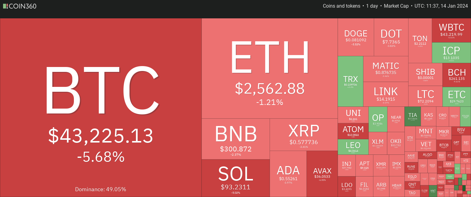 Last week, there was strong anticipation that Bitcoin’s value would surpass $48,000 and settle close to $50,000 by the weekend. However, defying these forecasts, Bitcoin underwent a notable downturn, sliding towards $41,000, even following the SEC’s approval of a spot $BTC ETF. In spite of this downturn, Bitcoin has seen some rebound, presently hovering around the $43,000 mark. Current analysis indicates that a further decrease might happen, with $38,000 being a pivotal level for a possible strong recovery.