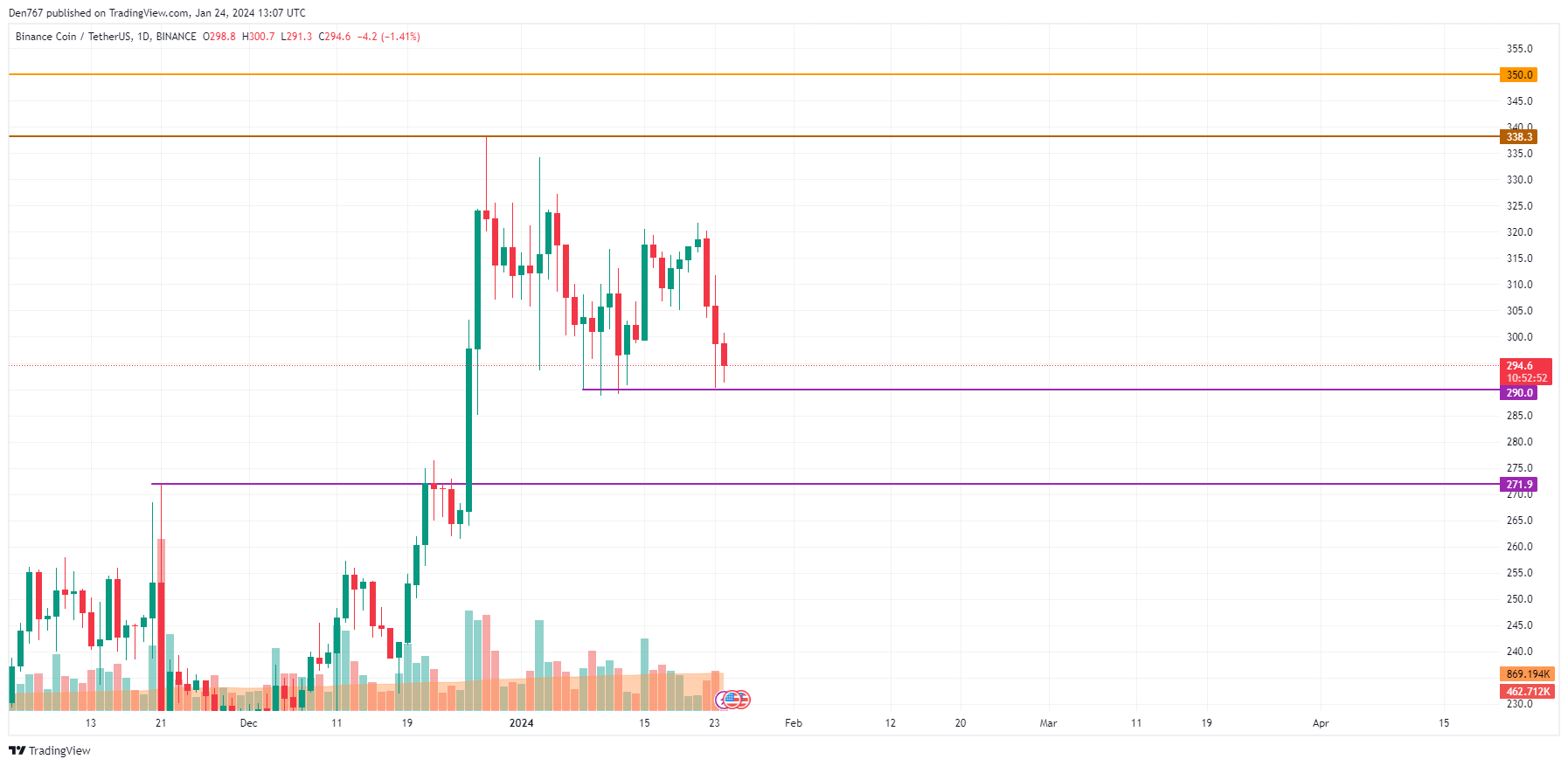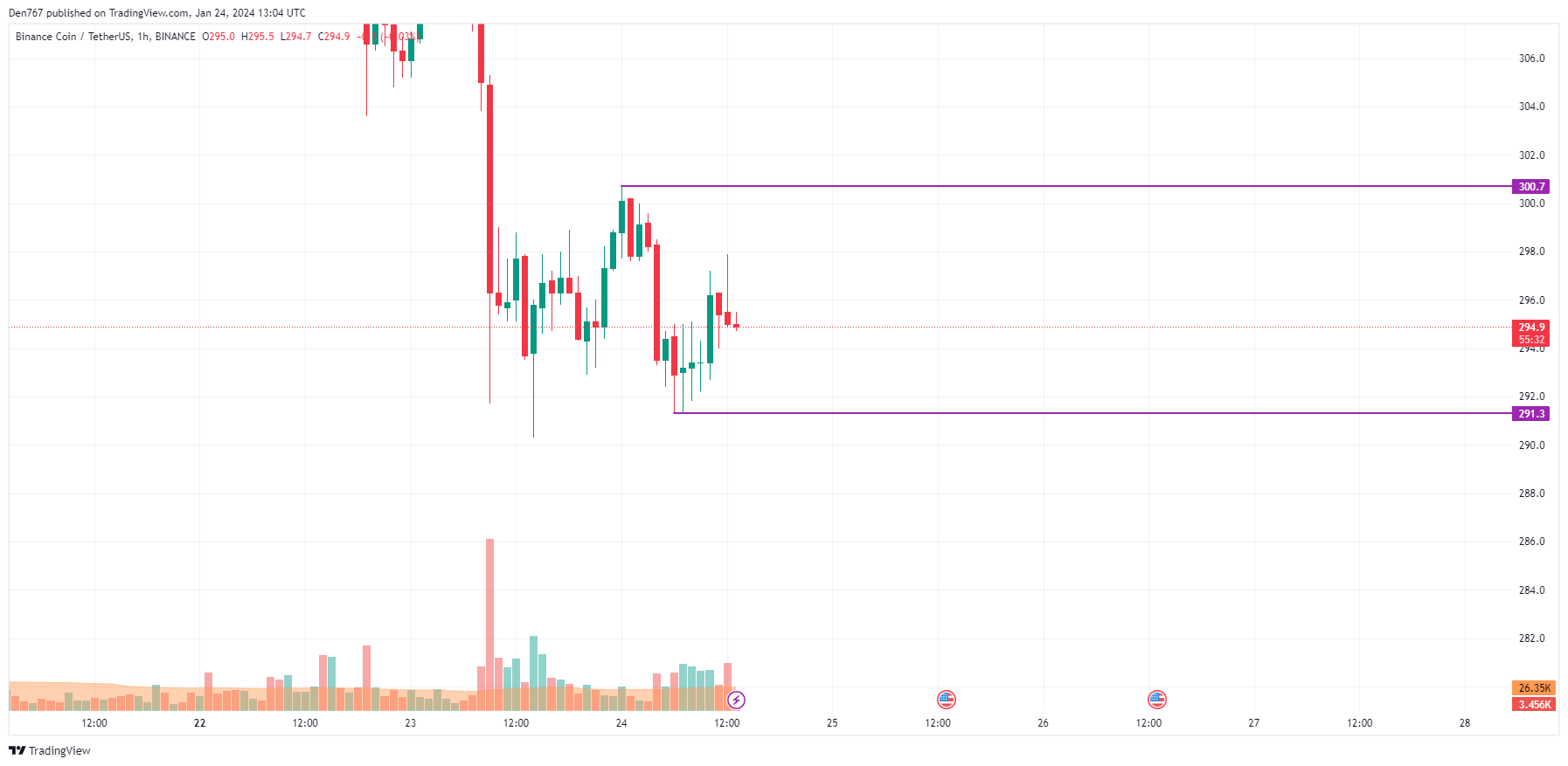 On the hourly chart, the rate of BNB is more bearish than bullish as it failed to fix above the vital zone of $300. If the situation does not change by the end of the day, one can expect a test of the support of $291.3 shortly.
