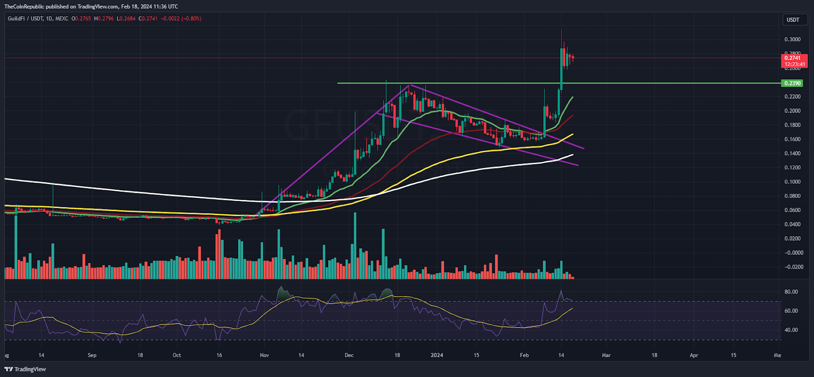The GuildFi token signifies a bullish flag pattern breakout and a sharp bounce from the 50-Day EMA mark was witnessed. The token has jumped from $0.1600 and sharply exceeded $0.2400, the major hurdle and noted a surge over 70% this week hinted at signs of institutional buying. For the past weeks, the token was trading in a consolidation and did not deliver any significant upmove. From the start of 2024, buying activity was noted and the token regained momentum and scratched above the neutral region.