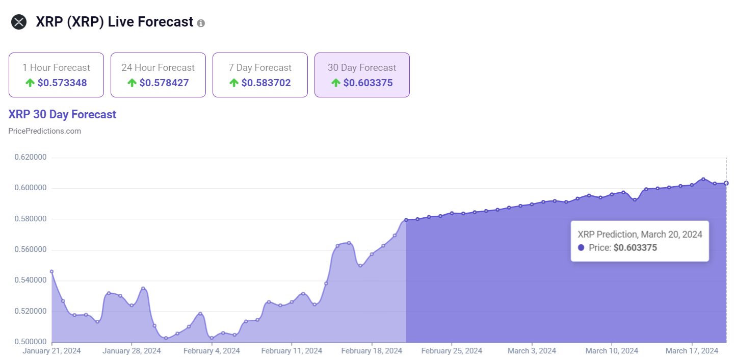 In terms of the price of XRP for the near future, i.e. in the next 30 days, the advanced machine learning algorithms used by the crypto market analytics and forecasting platform PricePredictions see a slight increase, having it set to reach $0.6034 by March 20, 2024, as per data retrieved on February 20.