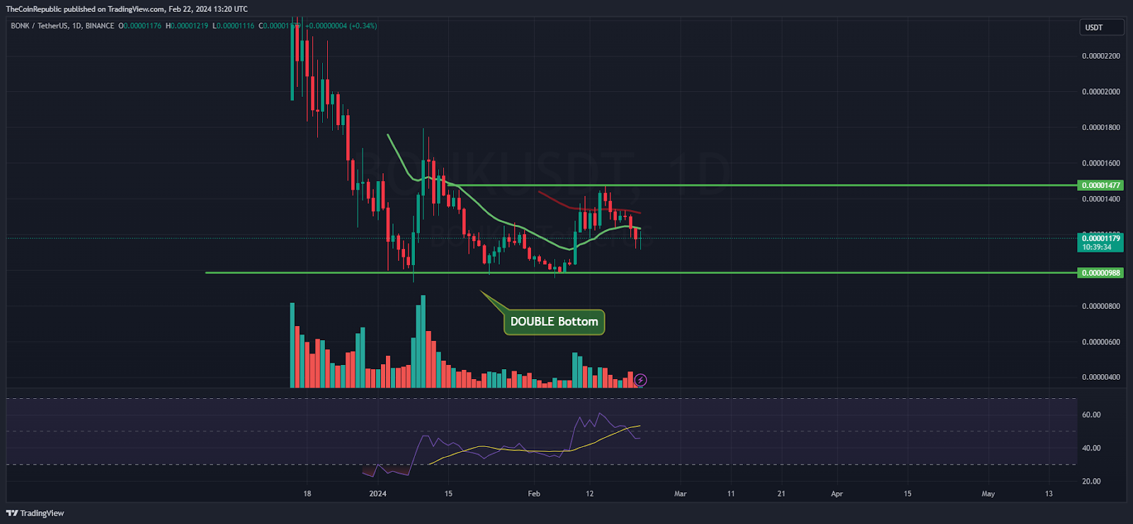 $BONK token price was persisted in delivering bearishness and is below the 50-Day EMA mark glimpsing a downtrend on the charts. Moreover, the token failed to register a breakout amidst the double bottom formation. Bulls have attempted to surpass the neckline of $0.000015000, but failed and a rejection was noted. The trend is negative and bulls are struggling for a pullback that might strike above the key hurdle of $0.000015000.