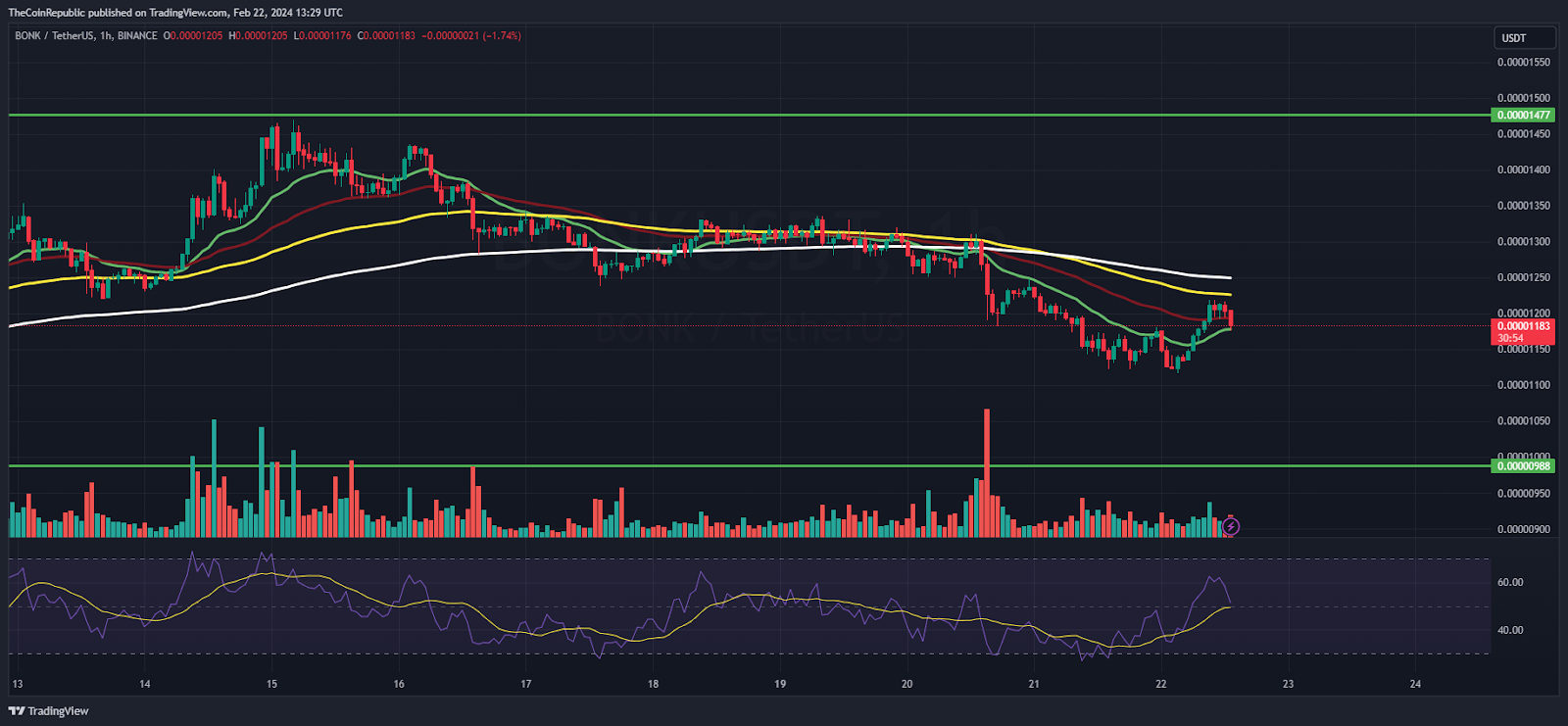 On the daily charts. $BONK token could not trigger a breakout and faced a selloff from the resistance mark of $0.00001500. Despite the rebound and a double bottom formation, the pullback did not exceed beyond the major hurdle and bears succeeded in securing the mark. Additionally, the rejection might have increased the likelihood of $BONK retesting the round mark of $0.00001000.