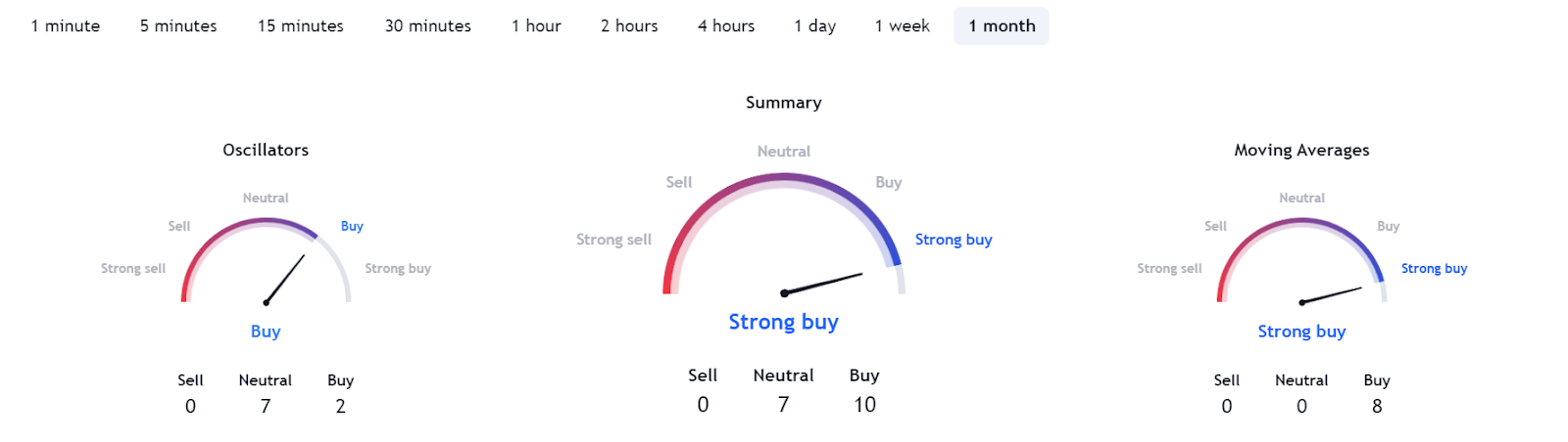 At the same time, positive price action and profit for holders have given rise to an exceptionally bullish sentiment for the so-called ‘Dogecoin (DOGE) killer,’ which currently rates as a ‘strong buy’ on its 1-day, 1-week, and 1-month technical analysis (TA) gauges, based on optimistic moving averages (MA) and oscillators.