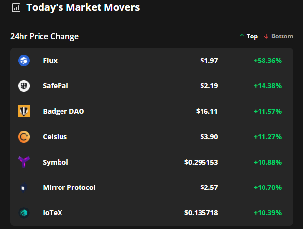 Data from Cointelegraph Markets Pro and TradingView shows that the biggest gainers over the past 24-hours were Flux (FLUX), SafePal (SFP) and Badger DAO (BADGER).