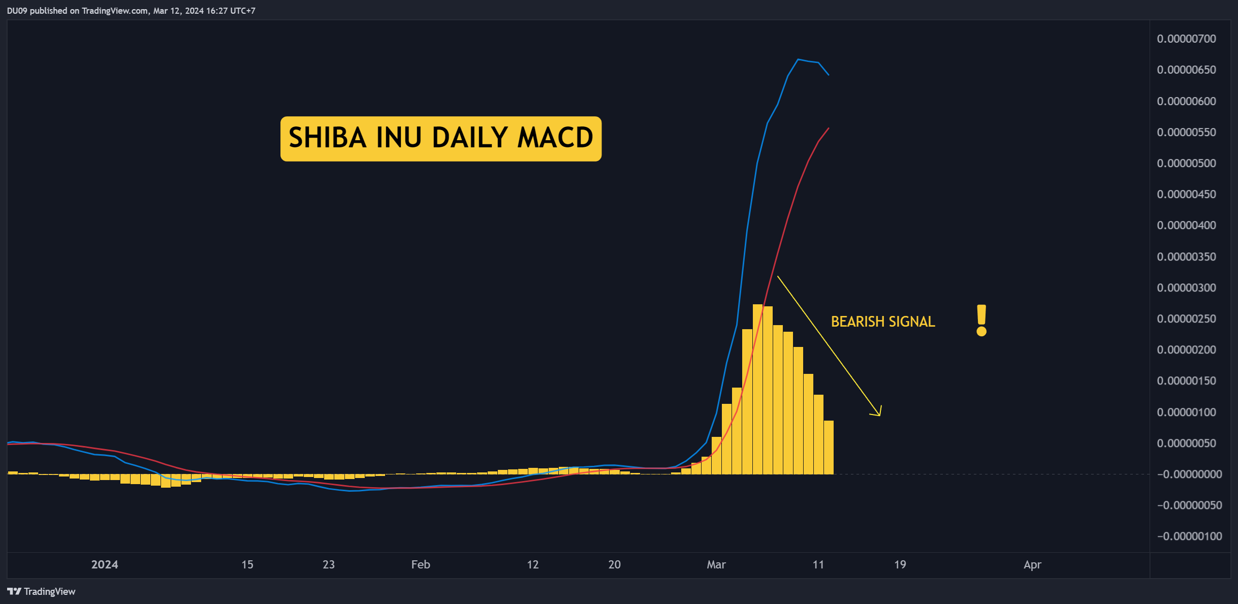 The daily MACD histogram is making lower highs. This is an early bearish signal. If the moving averages also make a bearish cross, then SHIB’s price may test the current support level before buyers return.