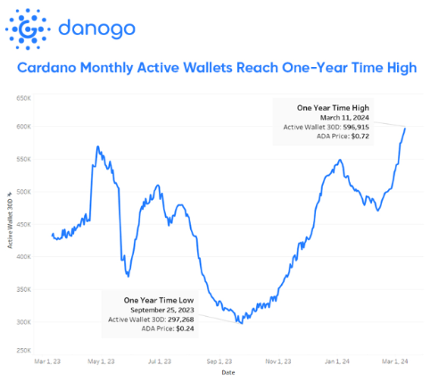 The Cardano (ADA) network has seen substantial surges in user engagement within the past month. Cardano-based DEX Danogo revealed intensified user activity within the blockchain, propelling active wallets to record highs.