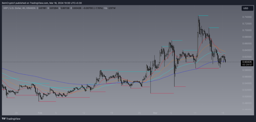 A watchful eye must be cast on the XRP 4-hour price chart, which currently hints at a potential floor of around $0.58. If this critical support crumbles, XRP could witness a deeper correction, plunging to $0.51, a 15% drop.