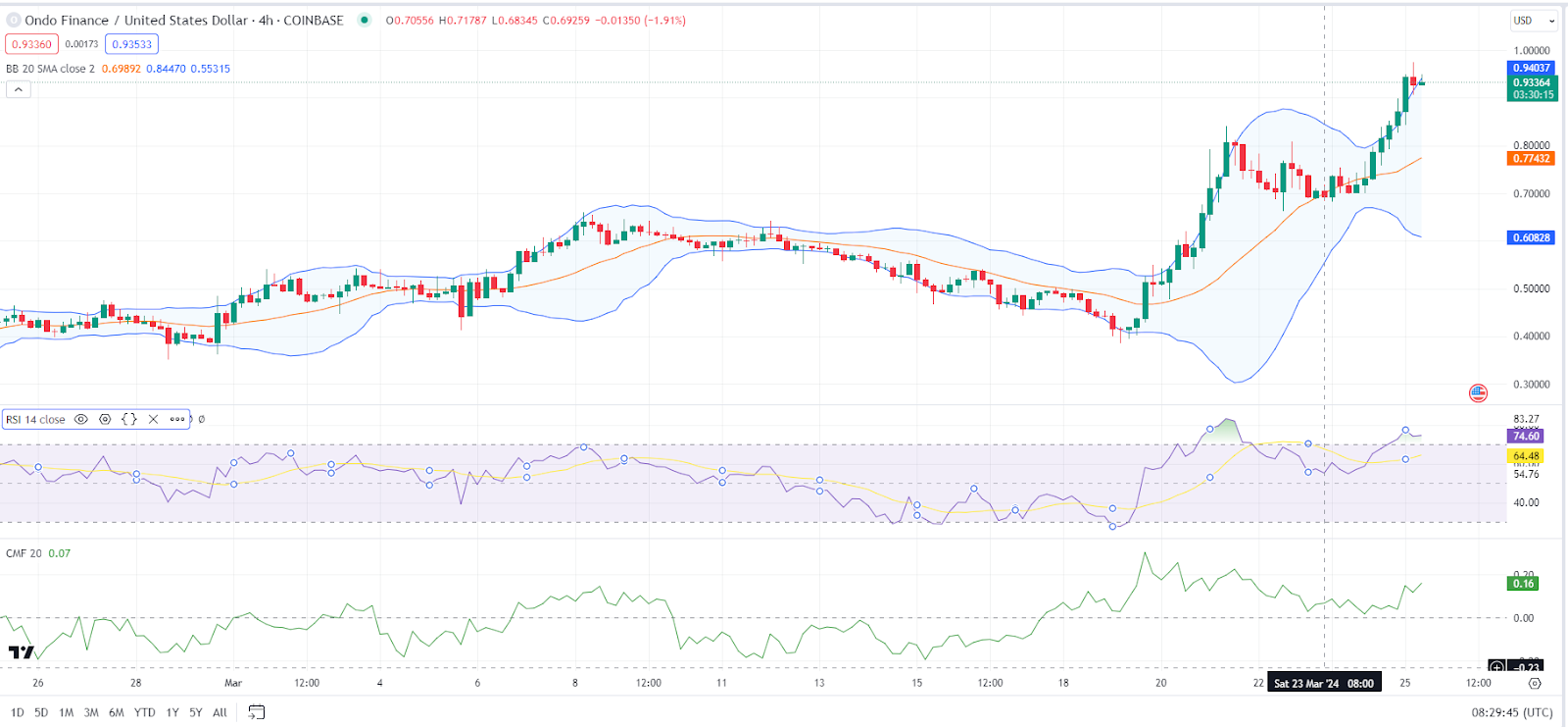On the ONDO/USD 4-hour price chart, the widening Bollinger bands, with the upper and lower bands touching $0.94309 and $0.60665, indicate that the price is very volatile. However, the price movement has broken through the upper hand and is now trading above it, signaling a likely positive trend. This might be a hint for traders to consider taking long positions in expectation of future price increases. On the other side, if the price fails to stay above the upper range, it may signal a reversal or correction.