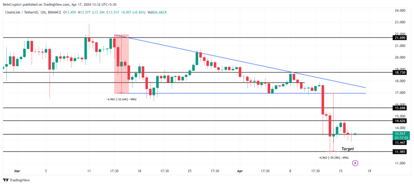However, there is also a chance that the altcoin could fall through the support of $13.4 to hit $12. This is the target price marked by the descending triangle Chainlink’s price, which LINK was stuck in a few days ago.