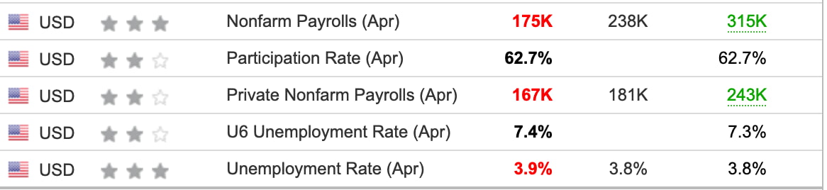 In April, Nonfarm Payrolls fell significantly short of expectations, with a reported 175,000 jobs added compared to the anticipated 238,000. This figure represents a nearly 45% decrease from March’s robust 315,000.
