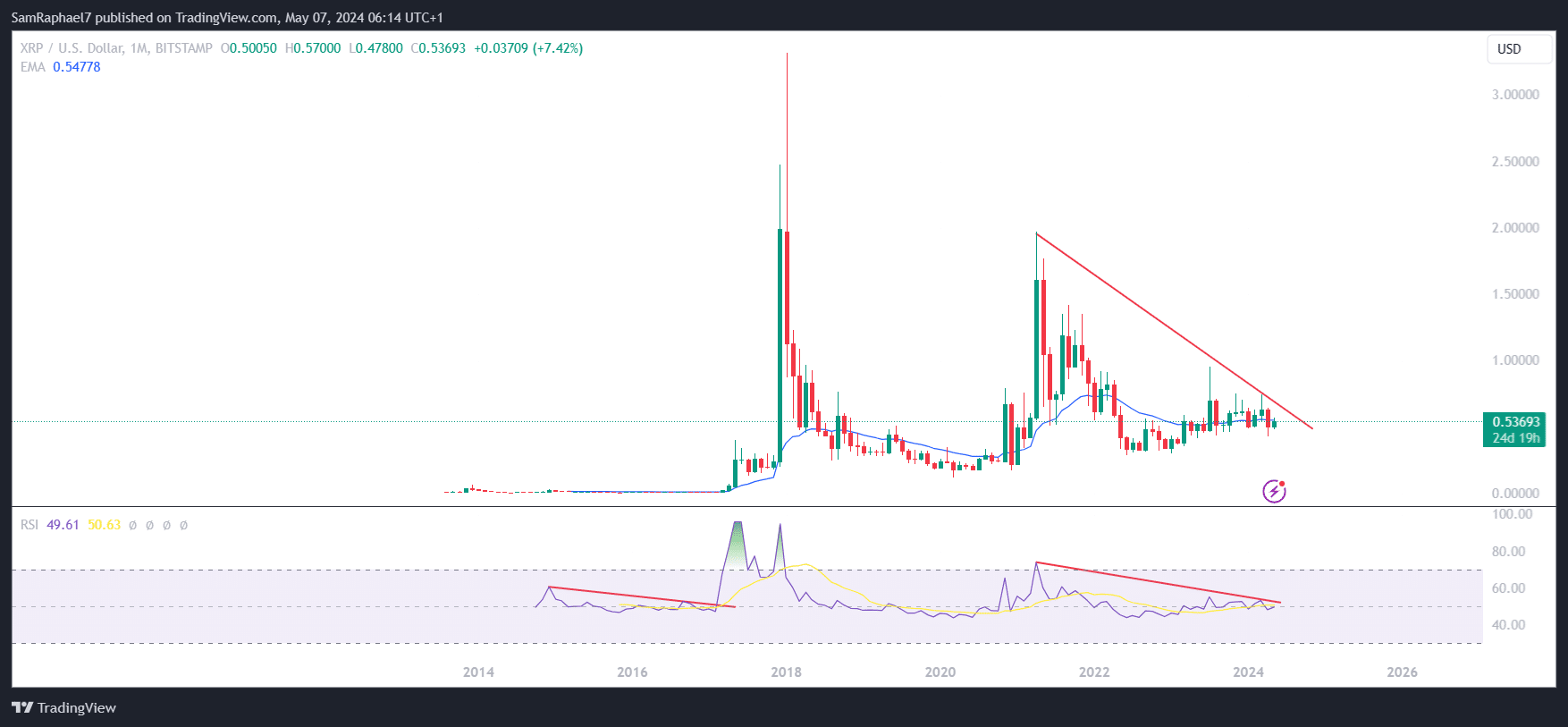 XRP has been trading within a symmetrical triangle on the monthly timeframe since it dropped from the $1.96 high in April 2021. Amid this triangle, XRP has continued to record lower highs and higher lows, essentially impacting its monthly relative strength index (RSI).