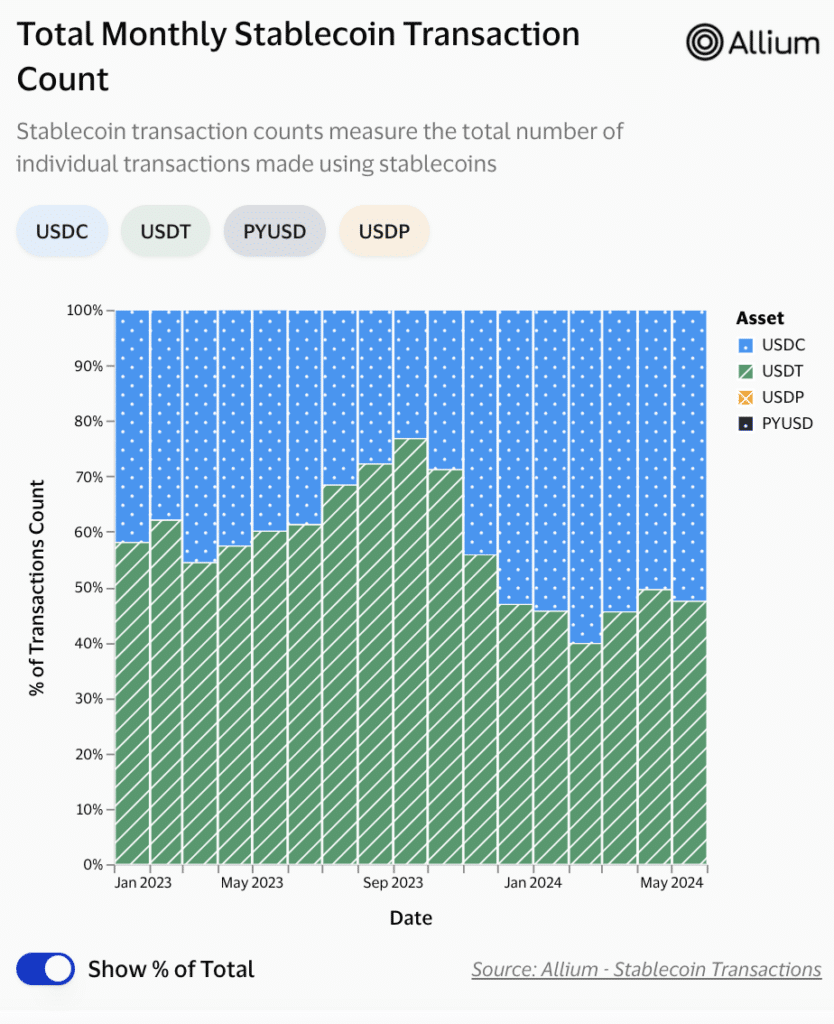 However, by the end of the year, this figure had more than doubled, exceeding 50% of all stablecoin transactions. Since December 2023, USDC has consistently accounted for a majority share of stablecoin transactions, reaching as high as 60% in February 2024.