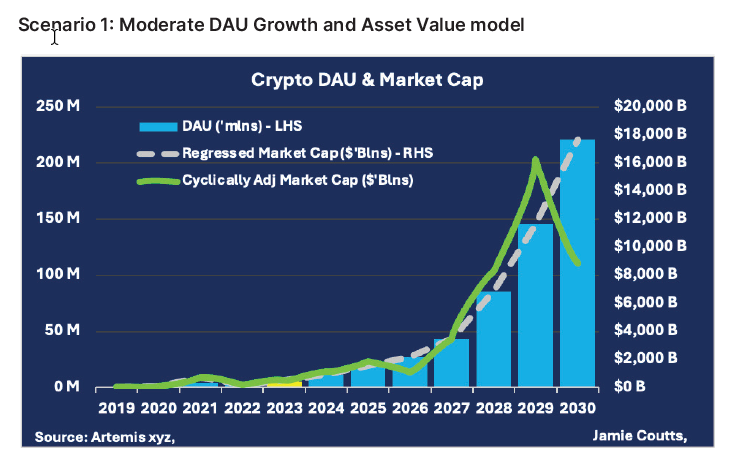 “By incorporating an ‘AI growth factor’ starting in 2026, which adds 10% to the annual growth rate, we can begin to gauge this impact. Initially, the effect is modest, but by 2030, AI agents could comprise over 40% of total daily active users (DAU). This obviously creates some rather astronomical valuations for the blockchain assets, which will benefit from the transaction fees generated by an increasing number of AI agents.”