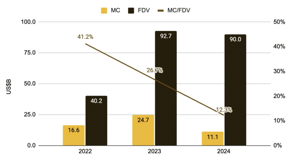 Binance experts have published a new report analyzing tokens launched in 2024. The study shows that the initial circulating supply to fully diluted value (FDV) ratio was the lowest in several years, indicating potentially high selling pressure that could negatively impact the crypto market.