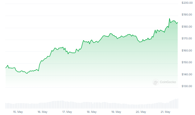 Meanwhile, at the time of writing, SOL was trading at $185, up 7.1% and 26.0% in the daily and weekly timeframes, data from Coingecko shows. This price surge, coupled with the network’s breakneck transaction speeds, paints a picture of a project with immense potential.