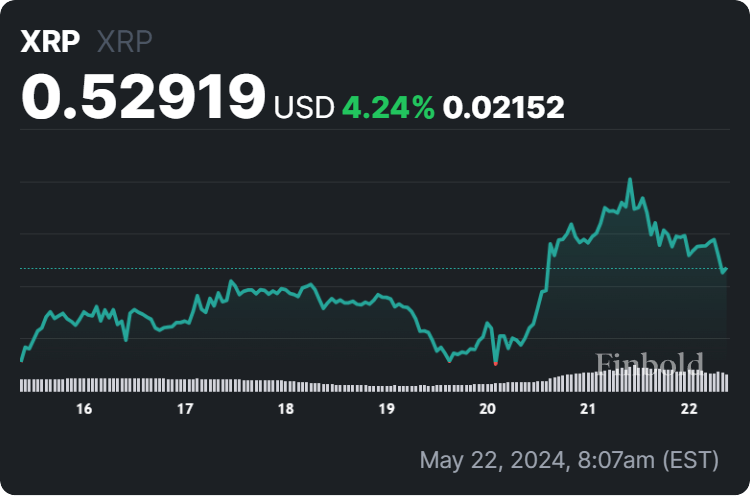 Currently, XRP is changing hands at $0.52919, suggesting a decline of 2.19% in the last 24 hours but still recording an increase of 4.24% across the previous seven days and yet accumulating a drop of 1.08% on its monthly chart, as per data on May 22.