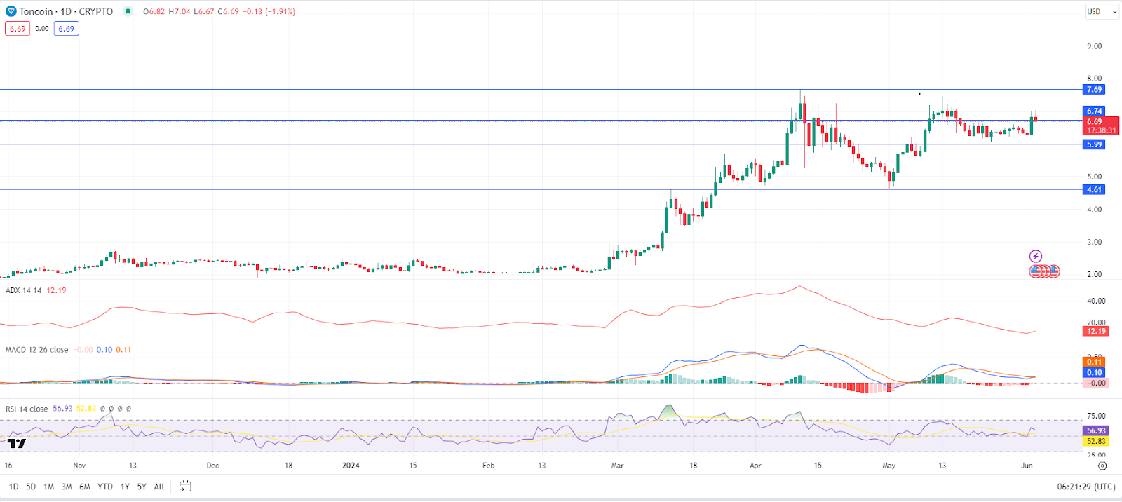 On the TONUSD 24-hour price chart, the Average Directional Index (ADX) rating of 12.19 suggests that the bull rally may be losing momentum. This trend could indicate a potential price correction or consolidation period for Toncoin before another rally.
