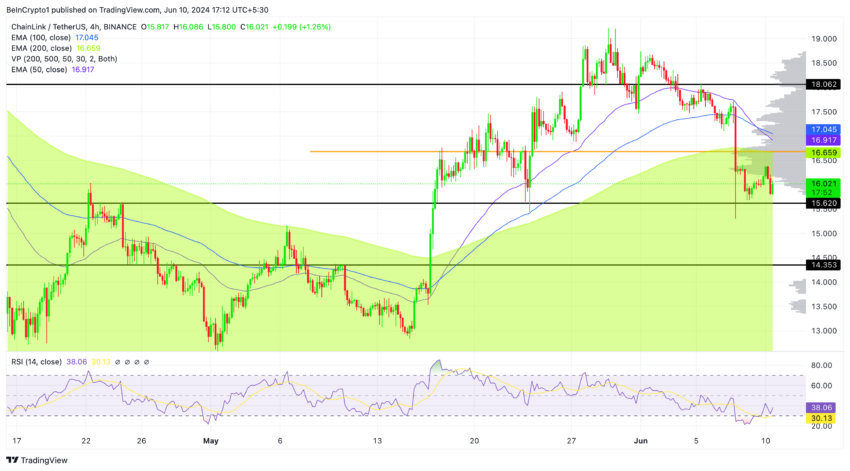 LINK has broken key support levels, notably $17.40, which corresponds to the 100 EMA (Blue line) on the 4-hour chart. The volume profile peaks at $16.70.