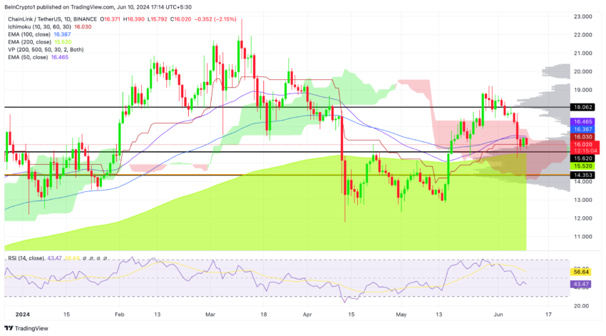 On the daily price action, Chainlink has entered the Ichimoku Cloud, indicating a very bearish signal. The RSI has also dropped significantly from 70 to 43 within this time frame.