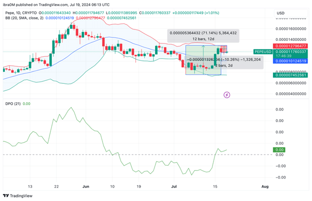 PEPE price has recently experienced a notable increase of 71.14% over a 12-day period, reaching a high of approximately $0.000011796. This upward movement is characterized by a breakout above the 20-day Simple Moving Average (SMA) and the middle Bollinger Band, indicating a strong bullish momentum. However, the price encountered resistance at the upper Bollinger Band around $0.000012796, where it appears to have consolidated.