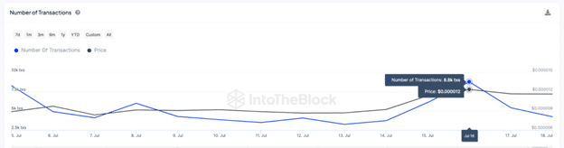 Daily Transactions count is a proxy for measuring, investors’ enthusiasm, and short-term network demand. PEPE Investors conducted 8,800 transactions when the markets peaked for the month on July 16. Unsurprisingly, within 24-hours PEPE price hit a 25-day peak of $0.000013 on Wednesday July 17.