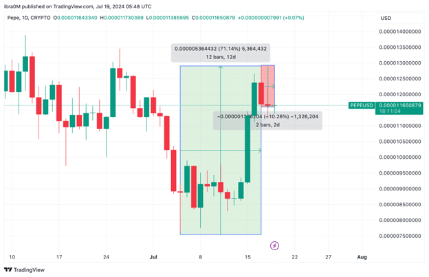 Between July 5 and July 17, the PEPE price had increased by a whopping 71.14%, from a 100-day bottom of $0.000007 to reach the $0.000013 level on Wednesday. This sparked hopes that the PEPE price could reclaim the all-time highs of $0.000017 recorded back in May. However, over the last 48 hours, those bullish speculations have gone cold.