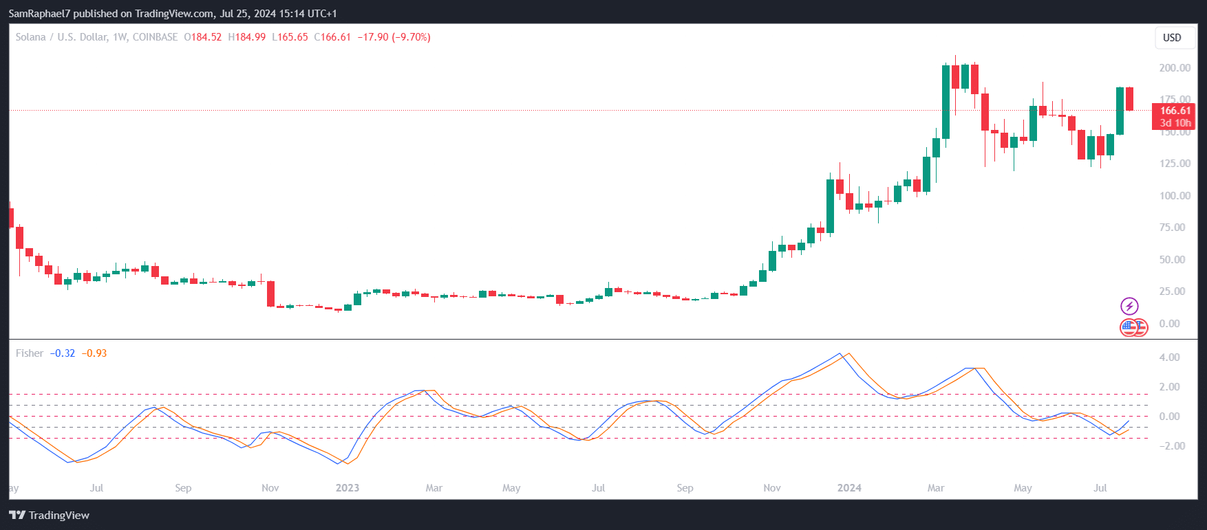 Solana currently trades around $166.61, representing a significant 9.70% decline this week alone. The Fisher Transform indicator currently shows a negative reading. This indicator, often used to identify turning points in the market, suggests that the recent price movement might not immediately align with the bullish breakout expected from the pennant.