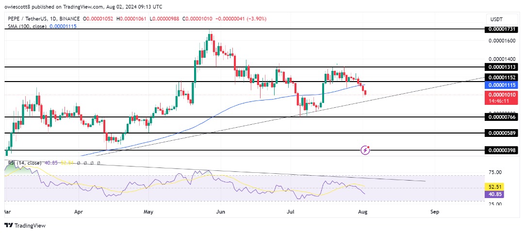 Technical analysis on the 1-day chart reveals that, following the rejection at $0.00001313, PEPE has been on a bearish trajectory toward the bullish trend line, marked by the formation of multiple bearish candlesticks. Furthermore, the crypto asset’s price is trading below the 100-day SMA, suggesting a bearish market sentiment.