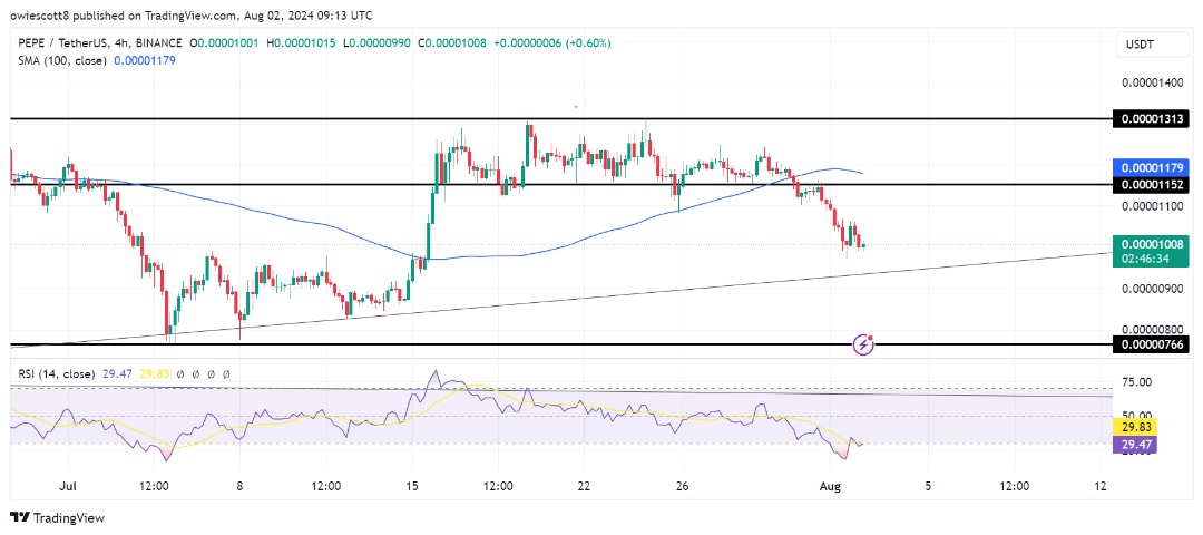 PEPE Bullish Trend Line Under Threat: $0.00000766 Level On Sight?