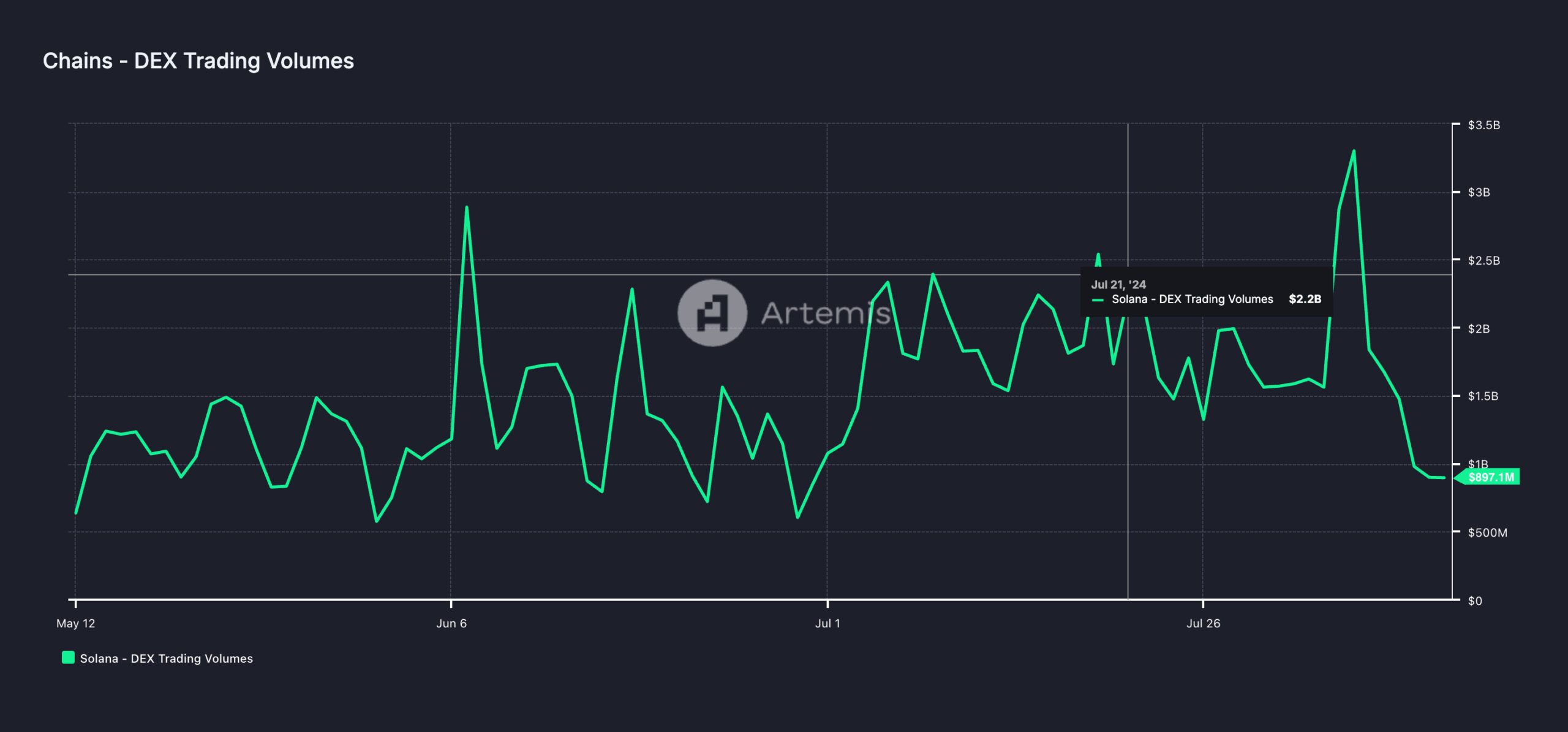 According to Artemis, Solana’s DEX volume has declined by 72% in the past seven days. On Sunday, it totaled $897 million, marking the network’s single-day lowest DEX volume since June 30.