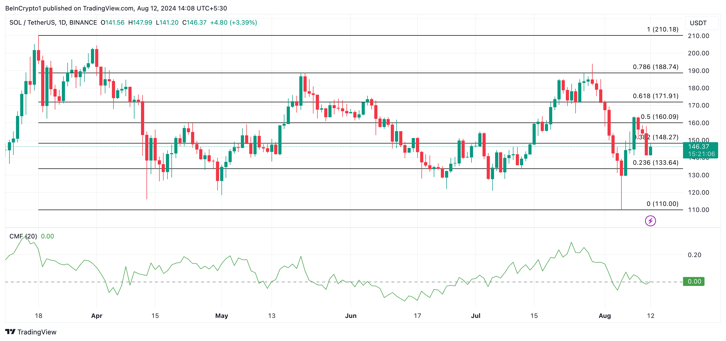 SOL trades at $146.31 at press time, climbing by 19% in the last seven days. However, readings from its Chaikin Money Flow (CMF) suggest indecision in the market as buyers and sellers alike begin to stay away from trading. At press time, SOL’s CMF rested on its center line at 0.