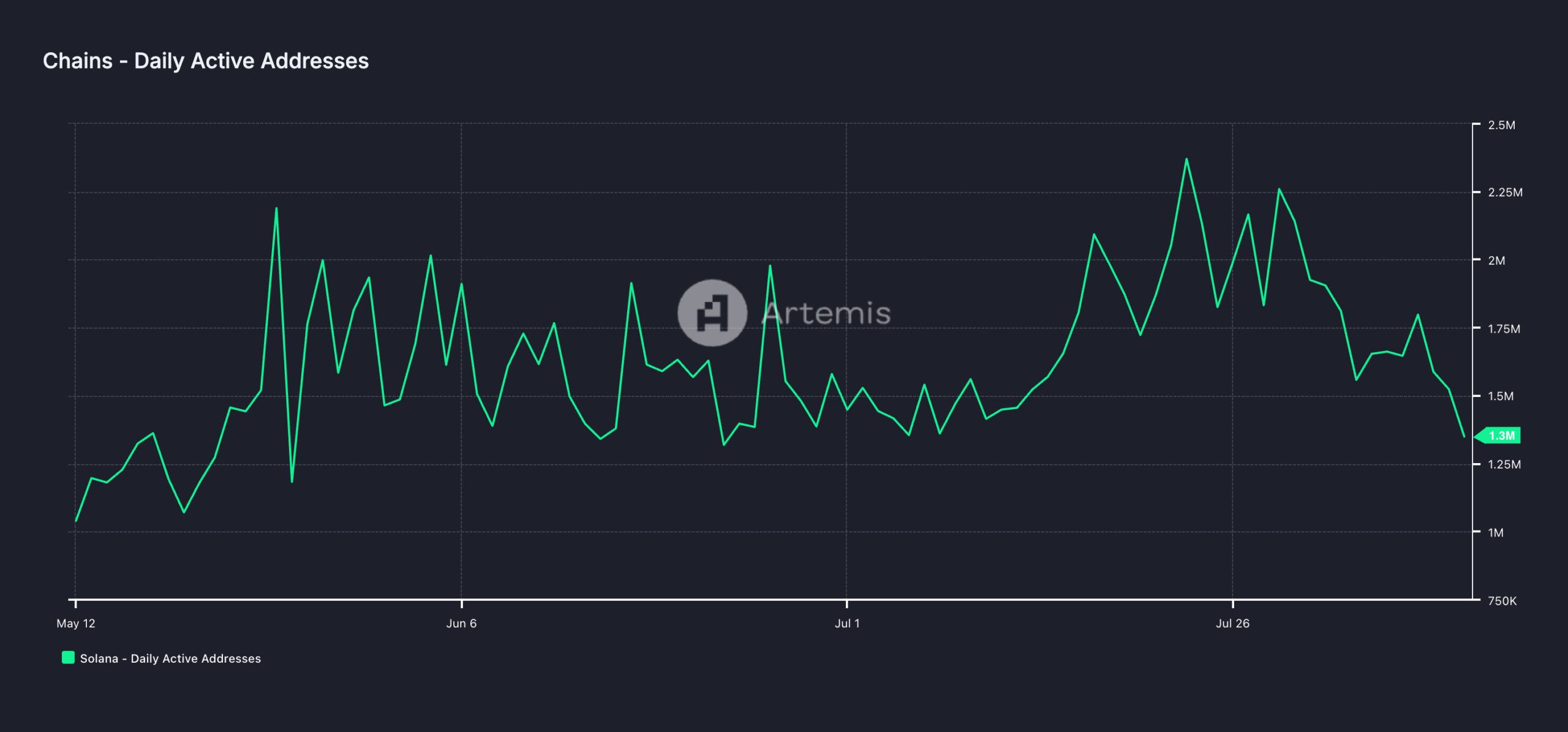 The drop in DEX volume mirrors the general drop in user activity on the network. Over the past week, user activity has plummeted. During that period, the daily count of addresses that have completed at least one transaction on Solana has dropped by 19%.
