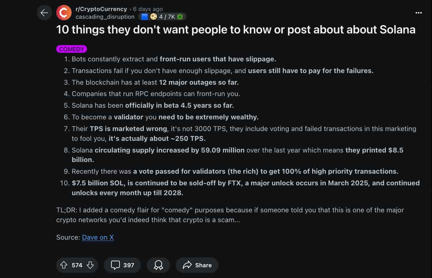 On August 12, a Reddit post on r/CryptoCurrency listed the “10 things they don’t want people to know or post about Solana.” The post received nearly 600 upvotes and 400 comments, making it highly relevant to the crypto community.