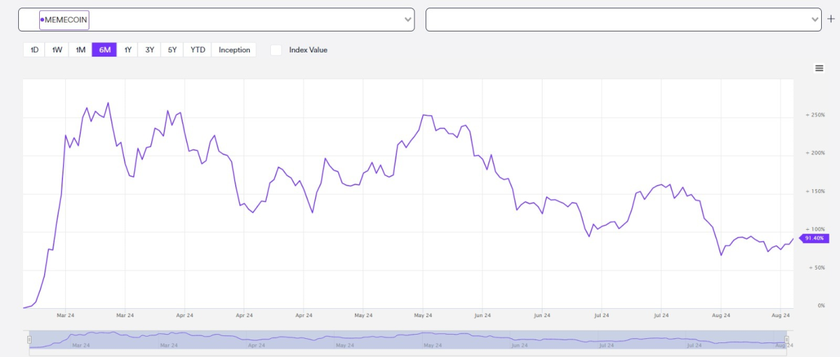 Additionally, some Solana-based decentralized exchanges, which handle a large portion of memecoin trading, have also seen declines in total value locked (TVL). According to DefiLlama data, TVL on Raydium has decreased by almost 20% in the last 30 days, while BonkSwap has fallen by more than 23% in the last month. Multi-chain memecoin indices have also declined in the last month. The Block’s GMCI Meme Index is down more than 17% in the last month, while Market Vector’s Memecoin Index has also reached a multi-month low.