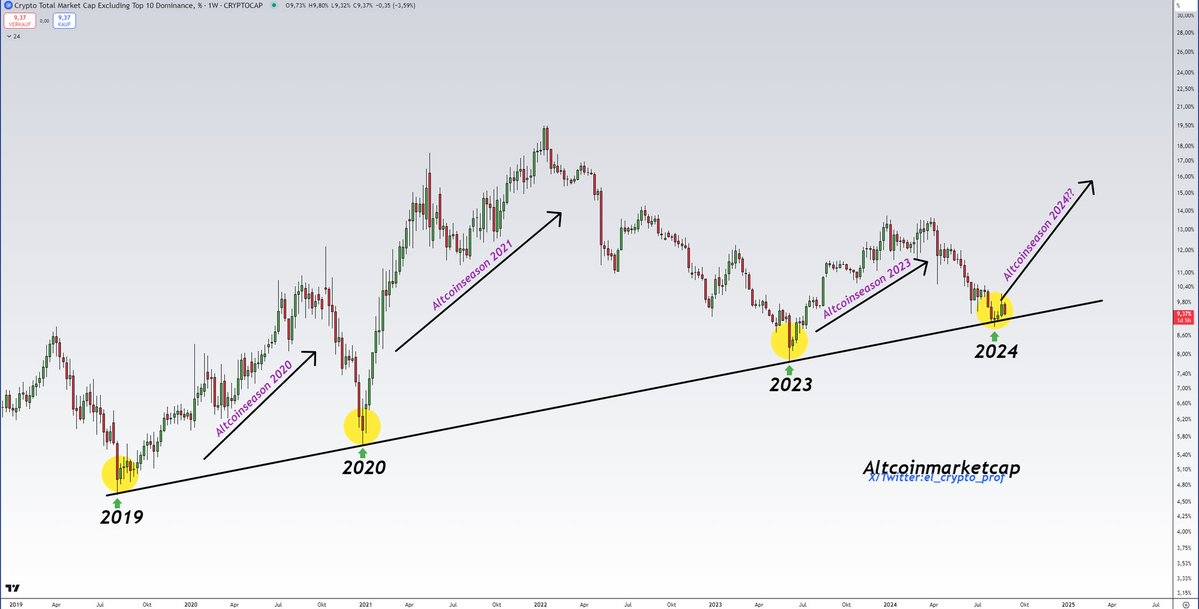 If you scroll through X (formerly Twitter), you’ll notice quite a few posts hyping up the arrival of altcoin season. Many users have been sharing a particular chart that originated from Moustache, a well-known crypto trading analyst with 133.6K followers on X. On Sept. 1, 2024, Moustache remarked, “Altcoins are on a trendline that has been of great importance for 5 years. In the past, every touch of this trendline has led to a subsequent altcoin season.”