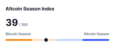 With the current value at 39, the index suggests a possible shift toward altcoins, though Bitcoin still holds a dominant position.