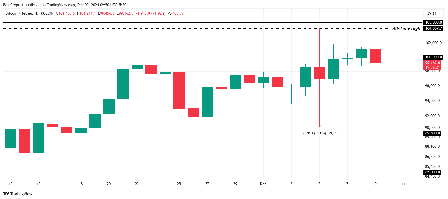 Bitcoin’s price has failed to establish $100,000 as a support level, dropping to $99,162 at the time of writing. This slip below the key psychological threshold reflects mounting bearish pressure, raising concerns among investors about Bitcoin’s ability to sustain its recent rally and maintain bullish momentum.