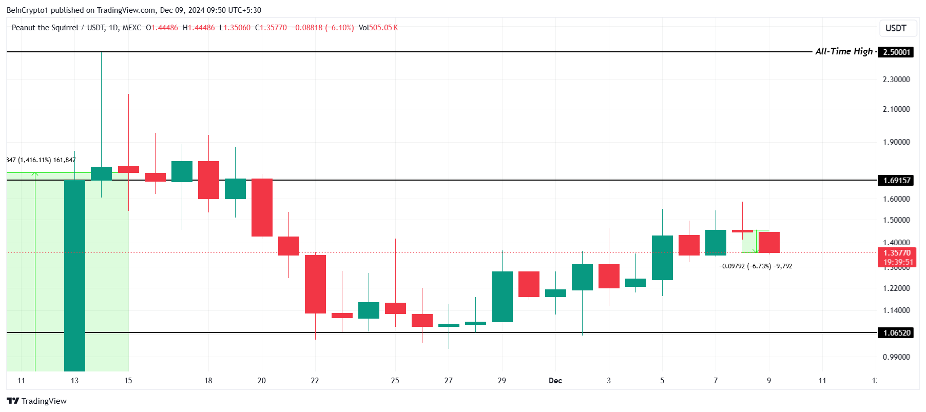 PNUT’s price dropped by 6.37% in the last 24 hours, bringing it down to $1.35. The decline in momentum has hindered the altcoin’s ability to sustain its previous uptrend. This downward shift reflects growing market uncertainty and highlights the challenges PNUT faces in reclaiming its bullish trajectory.