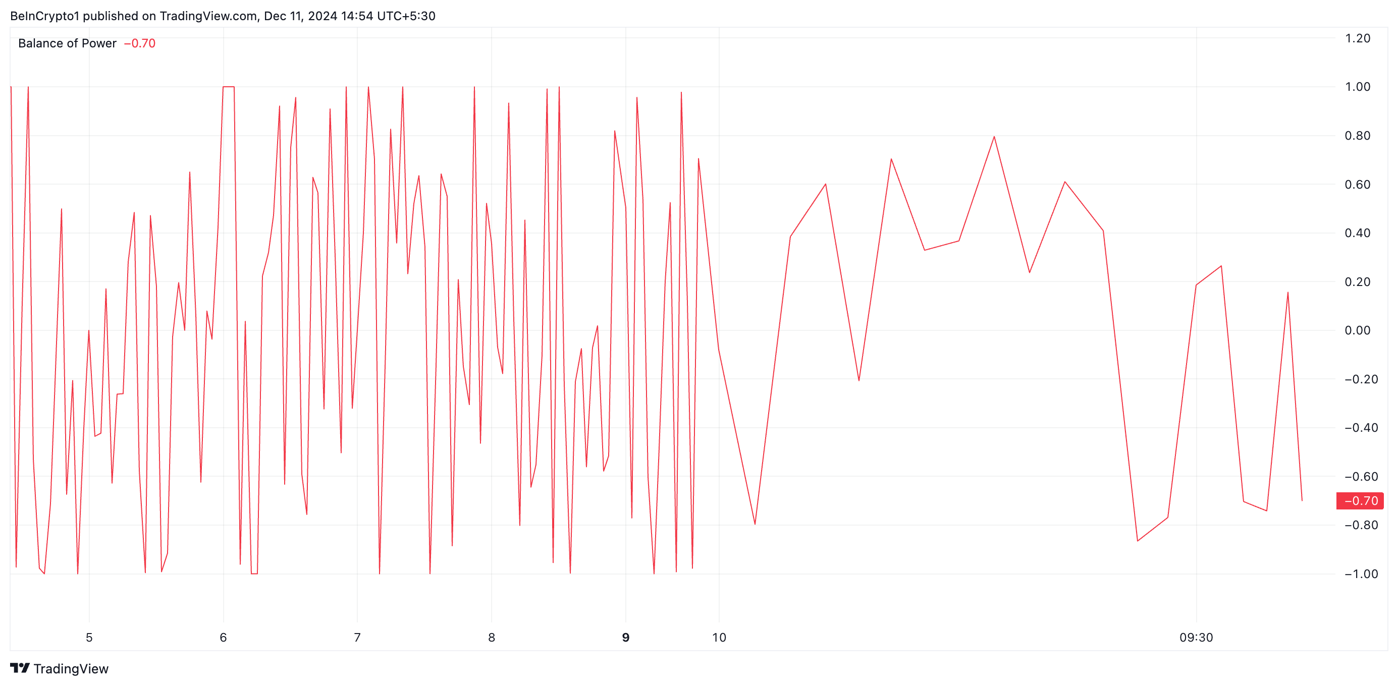 BeinCrypto’s assessment of the ME/USD one-hour chart confirms the uptick in bearish sentiments toward the altcoin. This is reflected by its Balance of Power indicator, whose value is below zero at -0.70 at press time.