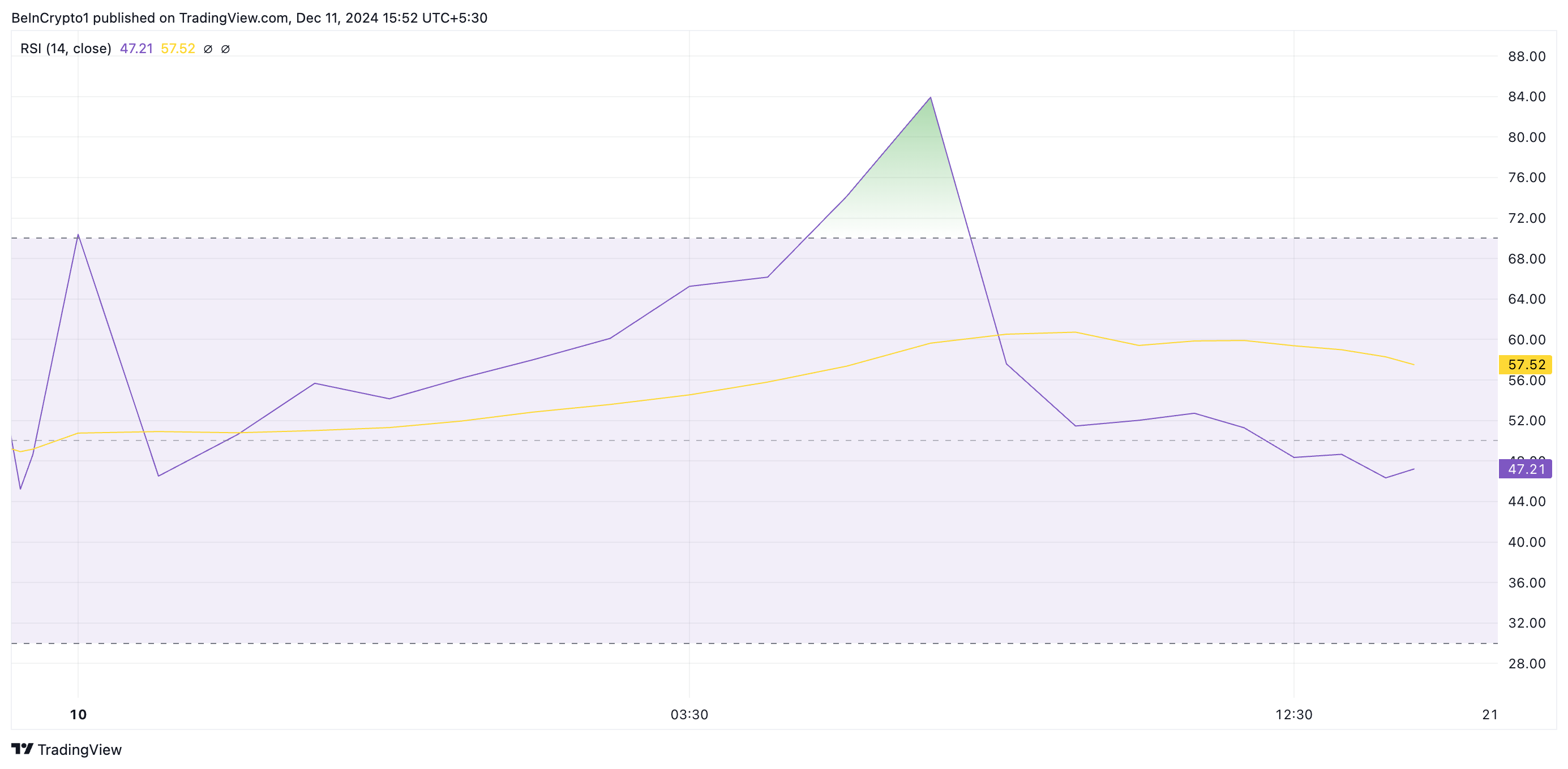 On the other hand, values below 30 indicate that the asset is oversold and may witness a rebound. An RSI reading of 47.21 confirms a gradual uptick in selling pressure as bearish sentiment gains momentum.