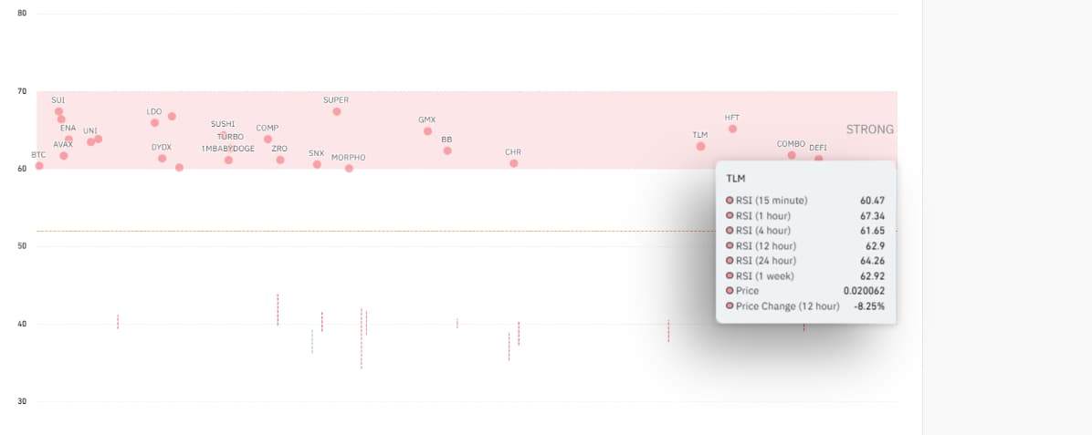 Meanwhile, the RSI values add another layer of validation. TLM’s RSI readings range from 60.47 in 15 minutes to 67.34 at one hour, with a 24-hour average of 64.26, outperforming the 12-hour market RSI of 51.99.