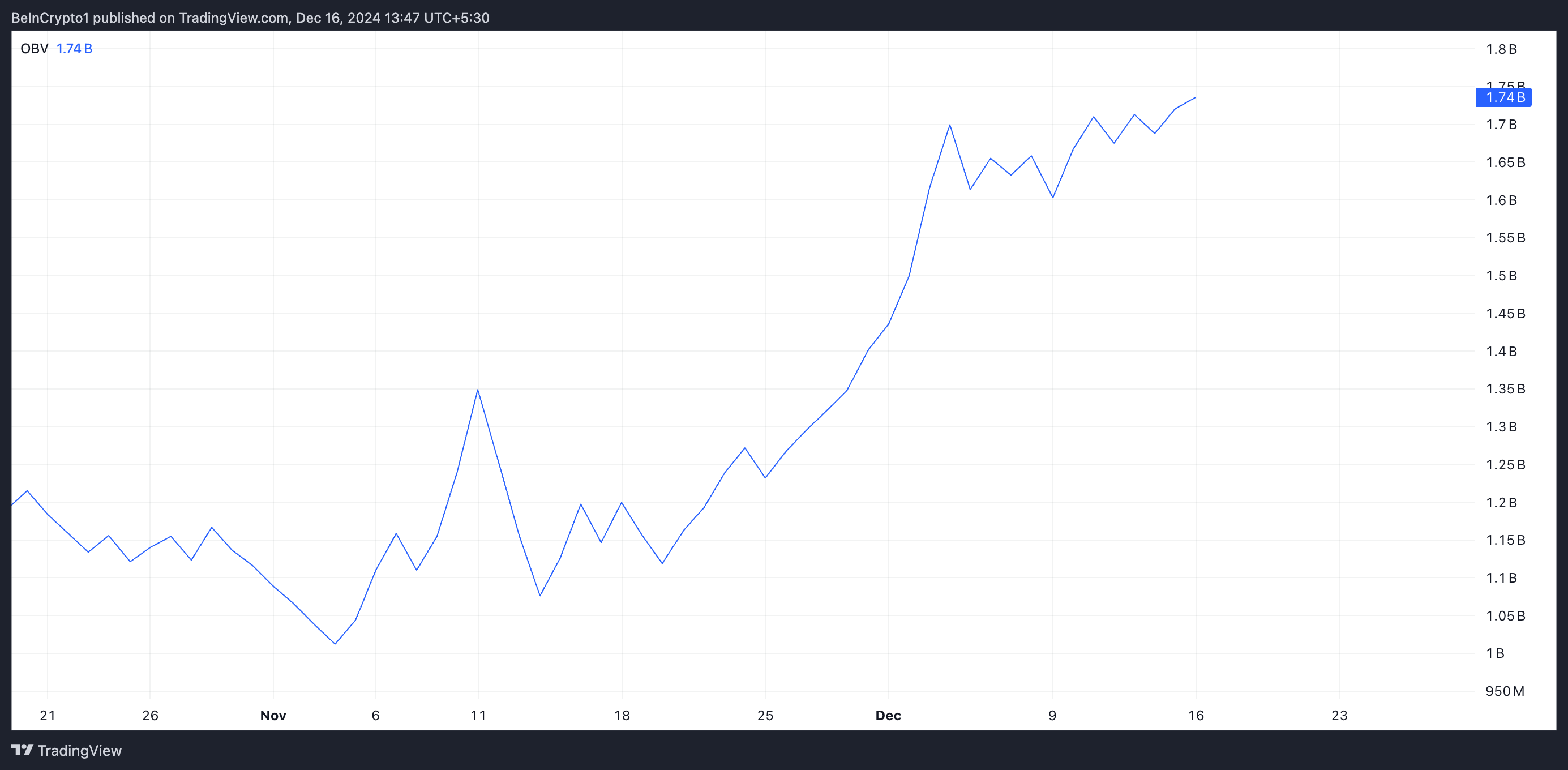 The OBV indicator tracks an asset’s cumulative volume. It adds volume on up days and subtracts it on down days to measure buying and selling pressure. When the OBV climbs during a price rally, it indicates that the price increase is supported by strong buying interest, suggesting that the upward trend may be sustainable.