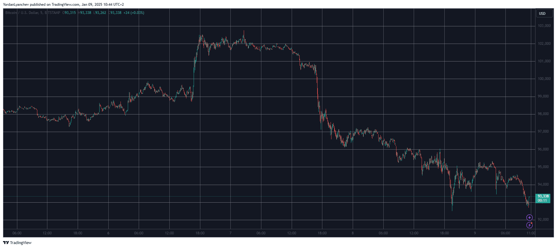 As the Thursday Asian trading session progressed, BTC dropped once again to under $93,000. Although it sits just above that line now, the asset has lost nearly ten grand since Tuesday morning.