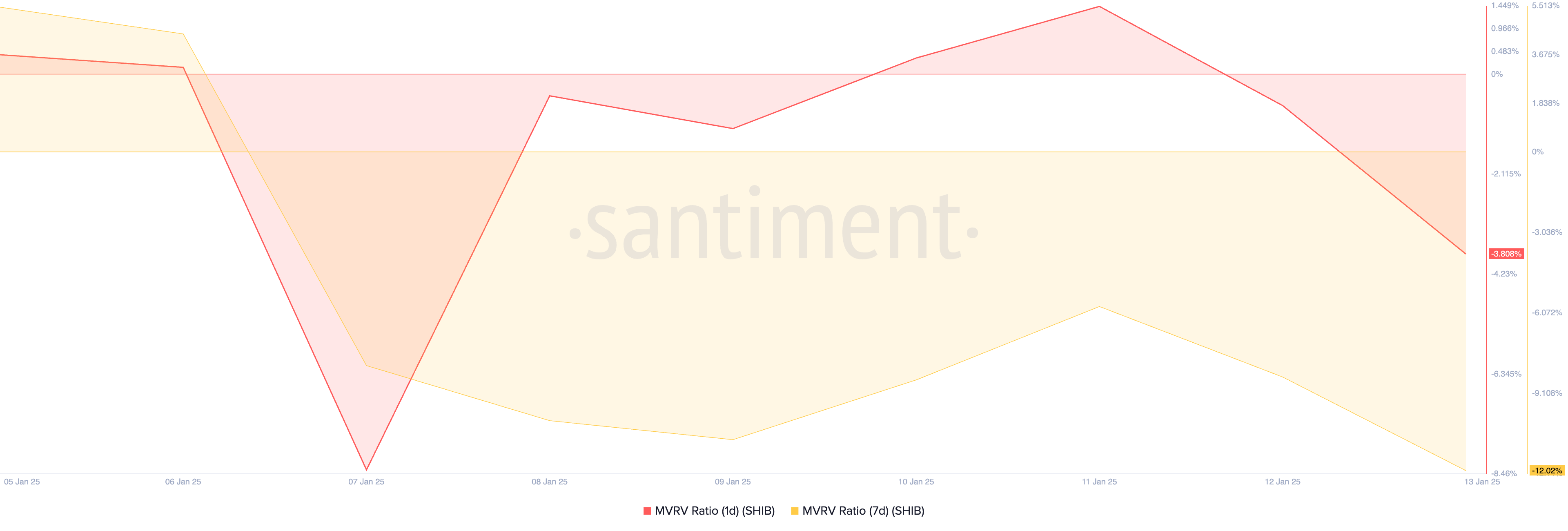 Shiba Inu’s market value to realized value (MVRV) ratio, which evaluates the overall profitability of its holders, indicates that the token is currently undervalued. The one-day and seven-day MVRV ratios stand at -3.80% and -12.02%, respectively, as of this writing.