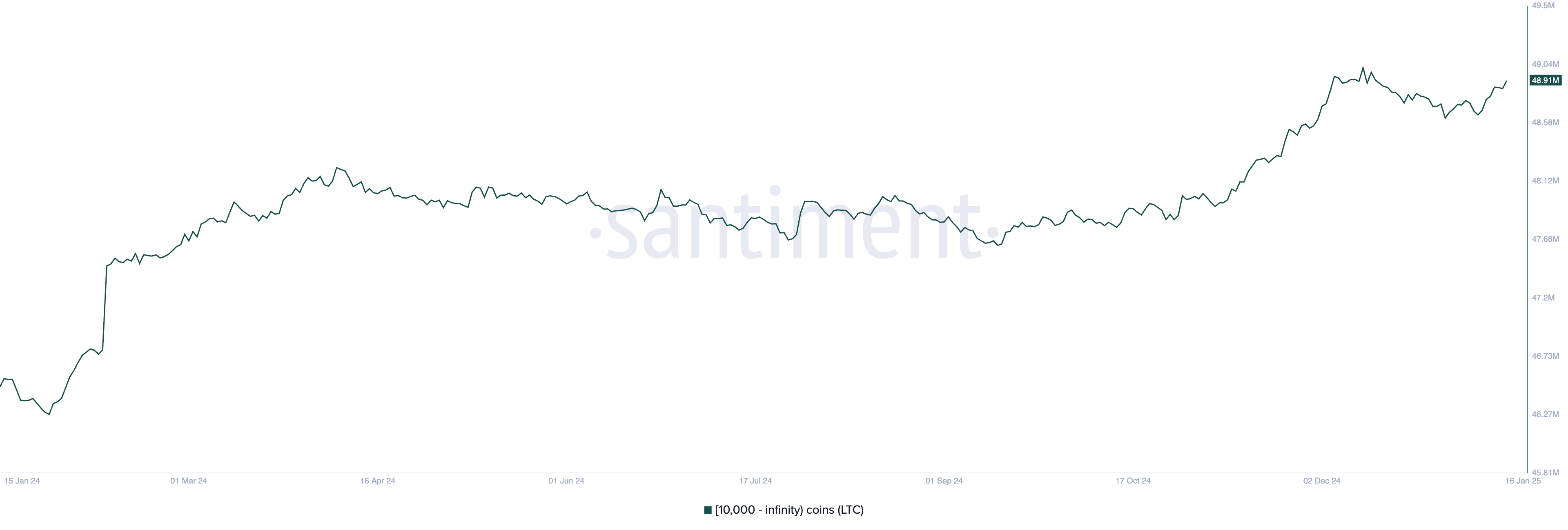According to Santiment, since January 9, Litecoin’s large investors, who hold more than 10,000 LTC, have acquired 250,000 coins valued at $30 million at current market prices. This brings the group’s total holdings to 49 million LTC, its highest in the past 30 days.