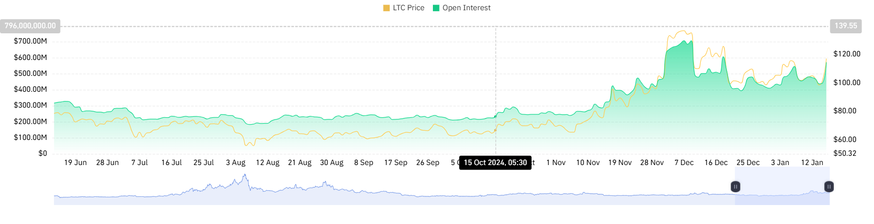 Adding to the bullish note, the LTC futures open interest shows a sharp surge to $571 Million. This data from CoinGlass hits implies growing trader activity and heightened anticipation for potential price movement.