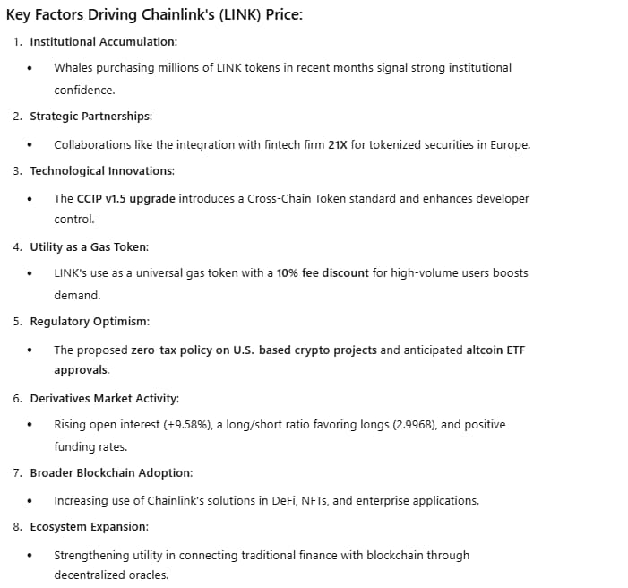 Broader market optimism is also adding to the token’s rise. The incoming U.S. administration’s proposed zero-tax policy on domestic crypto projects, alongside expectations of altcoin ETF approvals, has fueled positive sentiment. ChatGPT interprets these regulatory shifts as creating a favorable macro environment for $LINK’s growth.